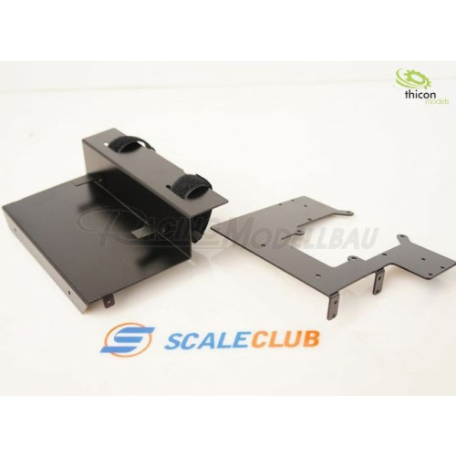 Das Bodenblech wird an den original Befestigungspunkten am Rahmen montiert. Hier kann auch das Lenkservo befestigt werden. Das 2. Blech wird in das Fahrerhaus geschraubt und stellt so die Bodenplatte mit Akkuhalterung dar. Zwischen den Grundplatten ist ein Hebelmechanismus montiert, der das Fahrerhaus vor Überkippen schützt.