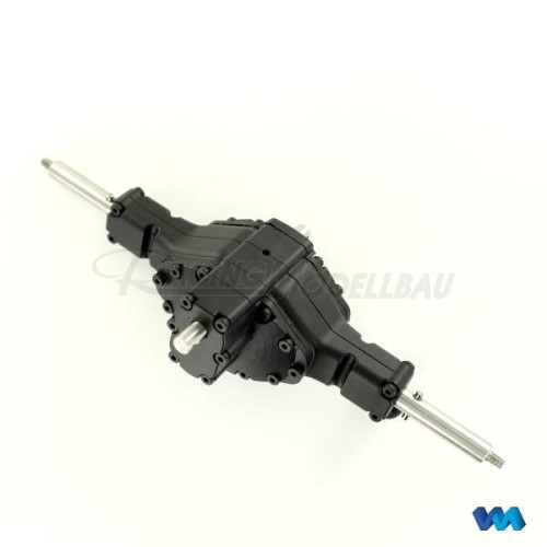 Die Achse ist mit einem selbstsperrenden Differenzial ausgestattet und kann mit, wie auch ohne Durchtrieb gebaut werden, es sind beide Wellen und Achsdeckel im Lieferumfang enthalten. Die Antriebsachse ist permanent gesperrt und macht bei einer Kurvenfahrt auf. Ein großer Vorteil dieser Antriebsachse ist, dass KEINE Schaltservos, Bowdenzüge und Anlenkungen für die Differenzialsperren benötigt werden. Dies kommt auch der Übersichtlichkeit und dem Platzangebot im Fahrgestell zu gute. Die Achskomponenten sind in einem hochbelastbaren verstärkten Kunststoffachsgehäuse untergebracht.