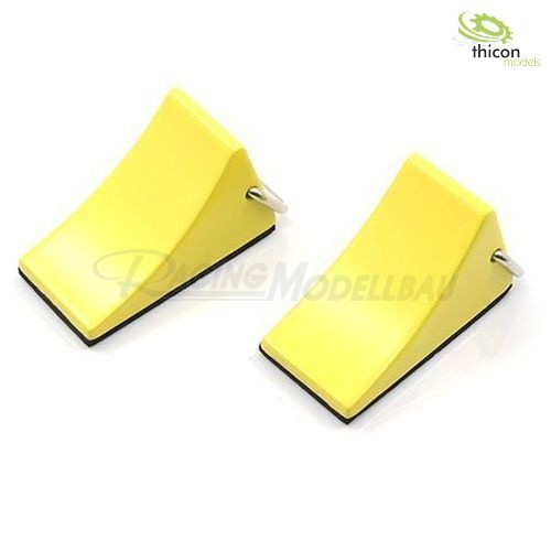 Aus Alu gefertigte Hemmschuhe mit antirutschboden in gelb mit Klappgriff 2 Stück.