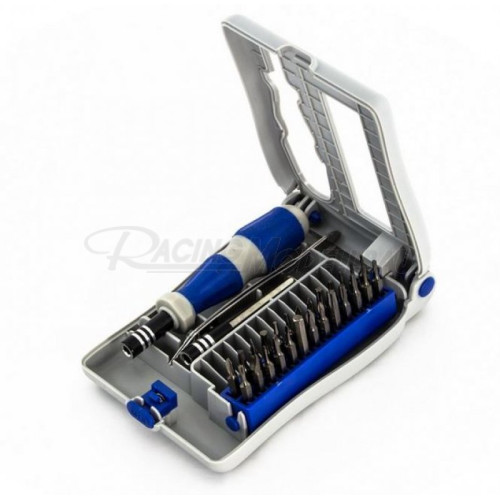 Das kleine 26-teilige Werkzeugset besteht aus einem Griff mit wechselbaren Bits und folgenden Bit-Einsätzen:
